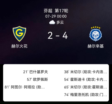 北京时间7月29日芬兰足球超级联赛联赛第17轮,格尼斯坦主场对阵赫尔辛基。格尼斯坦GabrielEuropaeus破门,ArturAtarah破门。赫尔辛基米歇尔梅开二度,霍斯蒂卡破门,梅里洛托破门。最终比分格尼斯坦2-4赫尔辛基。
