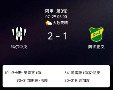 北京时间7月29日,阿根廷足球超级联赛秋季联赛第3轮,科尔多瓦中央SdE在主场迎战国与司法。比赛中,科尔多瓦中央SdE的贝索齐率先破门,为球队取得领先。随后,国防与司法由塞萨尔-佩雷斯扳平比分。比赛进入补时阶段,科尔多瓦中央SdE的加斯东-贝龙打入制胜一球。此外,国防与司法的德尔加多在补时阶段因累计两张黄牌被红牌罚下。最终,科尔多瓦中央SdE以2比1战胜国防与司法。