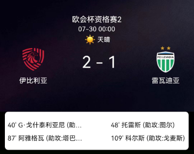 北京时间7月30日,欧洲协会联赛资格赛第二轮次回合,伊比利亚1999与塔林利瓦迪亚展开较量。比赛中,佩特森不慎自摆乌龙,为伊比利亚1999送上一分。随后,图尔送出助攻,帮助塔林利瓦迪亚的CarlosTorres破门得分。比赛临近尾声前,塔巴塔泽助攻阿格亚夸为伊比利亚1999再添一球。进入加时赛后,穆萨巴助攻基尔斯为塔林利瓦迪亚取得进球。最终全场比赛结束,双方以2-2的比分战平,两回合总比分伊比利亚1999以2-3不敌塔林利瓦迪亚。