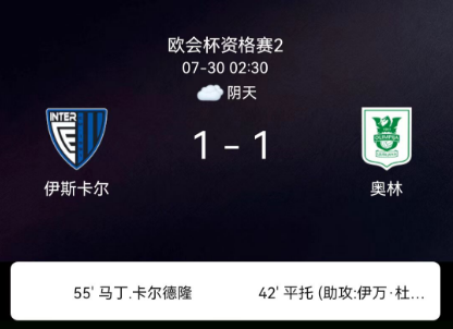 北京时间7月30日,欧洲协会联赛资格赛第二轮次回合,艾斯卡迪斯国际与卢布尔雅那奥林匹亚展开较量。上半场临近结束前,卢布尔雅那奥林匹亚由伊万-杜尔多夫送出助攻,迪奥戈-平托完成破门。下半场,艾斯卡迪斯国际的马丁-卡尔德龙成功攻入一球,为球队扳平比分。最终双方以1比1战平结束本场比赛。两回合总比分艾斯卡迪斯国际3比5卢布尔雅那奥林匹亚。