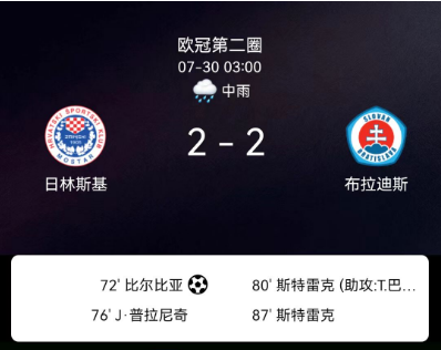 北京时间7月30日,欧洲冠军联赛资格赛第二轮次回合,莫斯塔尔日林斯基主场2-2战平布拉迪斯拉发,总比分2-6出局。比尔比亚点射+JakovPranjic扩大优势,斯特雷莱茨8分钟内双响救主。