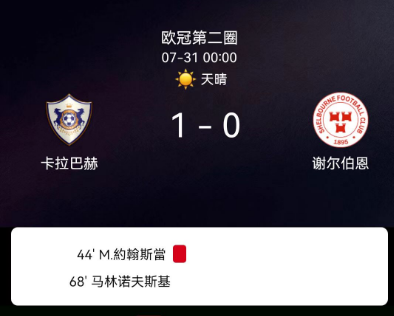 欧洲冠军联赛资格赛第二轮次回合,卡拉巴赫1-0小胜谢尔伯恩,以两回合总比分4-0晋级。约翰-马丁上半场自摆乌龙,卡迪点球失机,主队取胜。