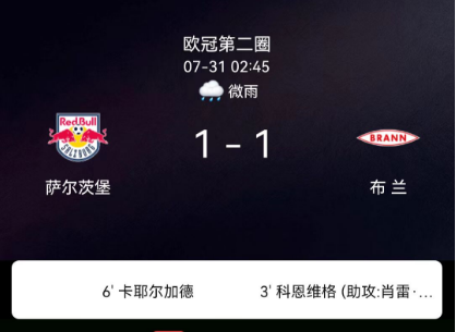 北京时间7月31日,欧洲冠军联赛资格赛第二轮次回合,萨尔茨堡红牛主场1-1战平布兰,总比分5-2晋级。科恩维格开场3分钟破门,凯尔高迅速追平。