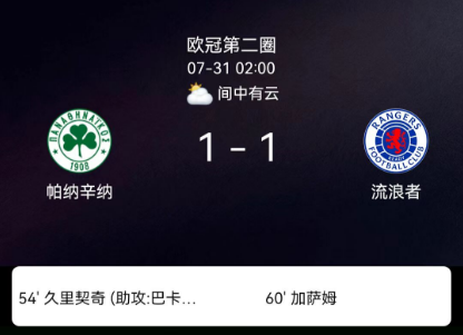 北京时间7月31日,欧洲冠军联赛资格赛第二轮次回合,帕纳辛奈科斯主场1-1战平格拉斯哥流浪者,总比分1-3出局。久里契奇接巴卡西塔斯助攻打破僵局,加萨马7分钟后迅速追平。