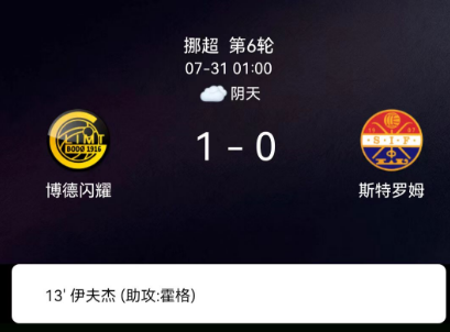 北京时间7月31日,挪威足球超级联赛第6轮,博德闪耀主场1-0小胜斯托姆加斯特。卡斯帕-霍上半场助攻埃夫连打入全场唯一进球,主队全取三分。