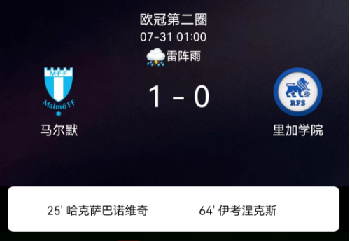 欧洲冠军联赛资格赛第二轮次回合,马尔默1-0小胜里加足球学校,两回合总比分5-1晋级。哈克萨巴诺维奇上半场破门,对手少打一人无力翻盘。