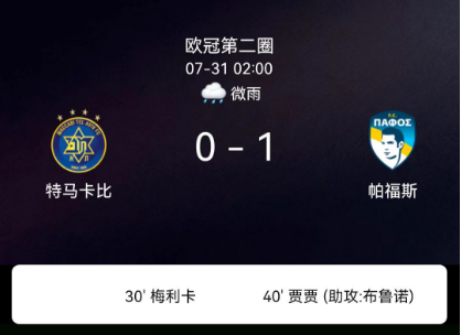 北京时间7月31日,欧洲冠军联赛资格赛第二轮次回合展开焦点战,特拉维夫马卡比主场迎战帕福斯。凭借贾贾的制胜球,帕福斯以1-0小胜对手,两回合总比分2-1淘汰主队晋级下一轮。