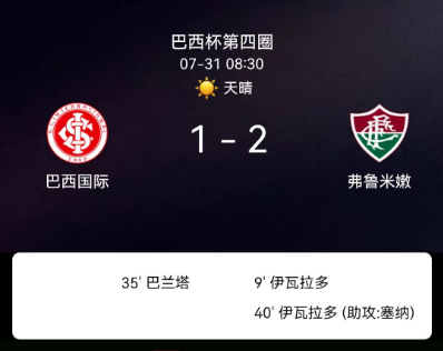 北京时间7月31日,巴西足球杯赛第四轮首回合打响一场焦点战,弗鲁米嫩塞客场2-1战胜巴西国际,为晋级次轮抢占先机。比赛中,弗鲁米嫩塞的埃韦拉尔多表现神勇,包办球队两粒进球,成为球队赢球的最大功臣。