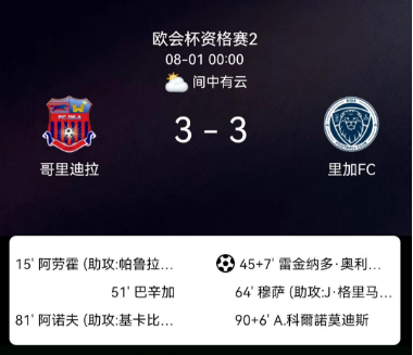 北京时间8月1日,欧足联欧洲协会联赛资格赛第二轮次回合上演跌宕起伏的进球大战,哥里迪拉主场3-3战平里加,以两回合总比分4-5遗憾出局。若昂-阿劳若、德奥-巴辛加、阿诺夫为哥里迪拉建功,里加则依靠雷吉纳尔多-拉米雷斯的点球、巴巴-穆萨的推射及塞尔诺莫尔迪斯的补时绝平,以总比分优势惊险晋级。