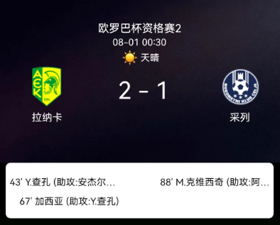 北京时间8月1日,欧足联欧洲联赛资格赛第二轮次回合,AEK拉纳卡主场2-1击败采列,以两回合总比分3-2惊险晋级。查孔贡献1球1助攻,安赫尔-加西亚锁定胜局,采列虽由克韦西奇扳回一球但无力逆转。