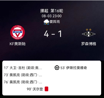 第90分钟:KFUM奥斯陆锁定胜局,罗森博格球员哈康-沃尔登在解围时不慎自摆乌龙,4-1,主队凭借对手失误彻底终结悬念。