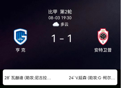 北京时间8月3日,比利时足球甲级联赛第2轮,亨克主场1-1战平安特卫普。安特卫普凭借柯克助攻文森特-扬森首开纪录,亨克则由扎特贝格尔助攻扎卡里亚-瓦赫迪迅速扳平,双方各取一分。