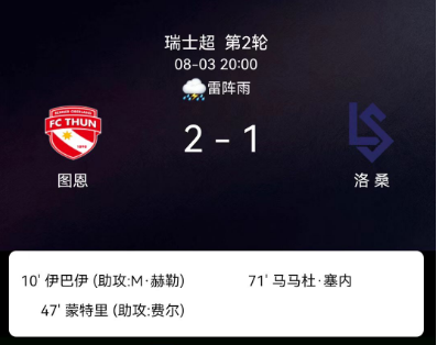 北京时间8月3日,瑞士足球超级联赛第2轮,图恩主场2-1战胜洛桑体育。伊巴伊上半场首开纪录,蒙托利奥下半场扩大优势,凯利-塞内终场前扳回一球,主队守住胜果。