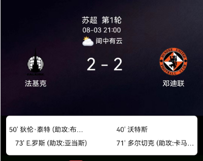 北京时间8月3日,苏格兰超级联赛第1轮,法基克主场2-2战平邓迪联。沃特斯首开纪录,泰特扳平;多尔切克反超,KieranMitchell终场前绝平,双方上演跌宕起伏的平局。