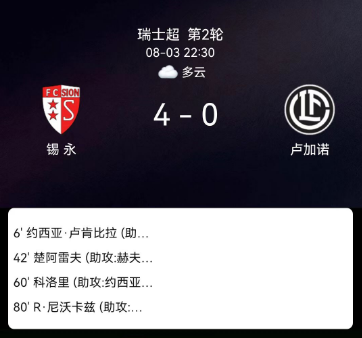 北京时间8月3日,瑞士足球超级联赛第2轮,锡永主场4-0大胜卢加诺。赫夫蒂上半场两度助攻破局,卢肯比拉、舒阿勒夫、科洛利、Rilind-Nivokazi先后建功,主队用一场酣畅大胜全取三分。