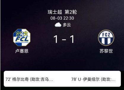 北京时间8月3日,瑞士足球超级联赛第二轮,卢塞恩主场1-1战平苏黎世。格尔比奇接迪朱斯托助攻打破僵局,乌梅-伊曼纽尔终场前接克拉斯尼奇助攻扳平,双方各取一分。
