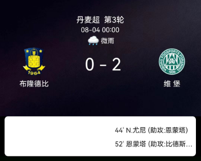 8月4日,丹麦足球超级联赛第3轮,维堡客场2-0击败布隆德比。YonisNjoh上半场补时阶段首开纪录,AnosikeEmenta下半场扩大优势,客队凭借攻防两端的稳定发挥全取三分。