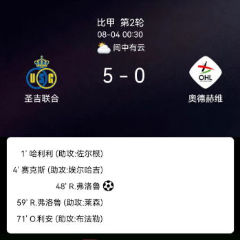 8月4日,比利时足球甲级联赛第2轮,圣吉联合主场5-0狂胜奥德赫维。哈利利开场闪击,赛克斯迅速扩大优势,弗洛鲁茨点射+梅开二度,奥塞努-尼昂终场前锦上添花,主队用一场屠杀全取三分。