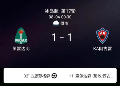 北京时间8月4日,冰岛足球超级联赛第17轮,贝雷达比主场1-1战平KA阿古雷。索尔达松上半场接西于尔吉尔松助攻首开纪录,冈恩劳格松下半场罚入点球扳平比分,双方最终握手言和。