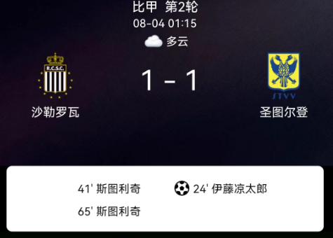 北京时间8月4日,比利时足球甲级联赛第2轮,沙勒鲁瓦主场1-1战平圣图尔登。伊藤凉太郎上半场罚入点球,什图利奇一度反超并染红离场,双方最终各取一分。