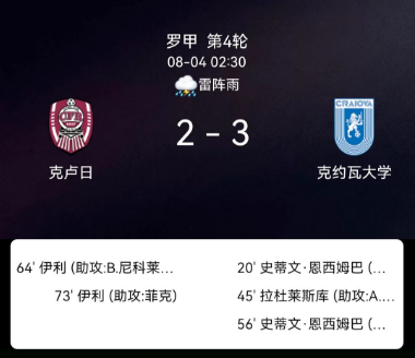 北京时间8月4日,罗马尼亚足球甲级联赛第4轮,克拉约瓦大学客场3-2逆转克卢日。Steven-Nsimba梅开二度,勒杜列斯库建功;克卢日伊利耶-马泰双响救主未果,客队凭借上半场建立的领先优势全取三分。