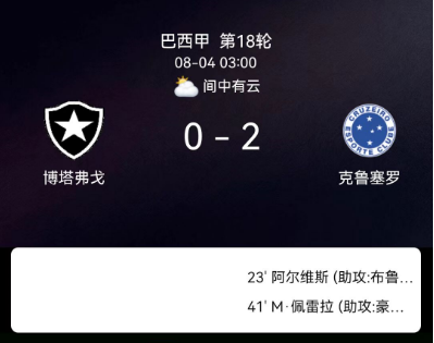 北京时间8月4日,巴西足球甲级联赛第18轮,克鲁塞罗客场2-0击败博塔弗戈。克里斯蒂安上半场接凯基助攻首开纪录,马特乌斯-佩雷拉终场前锁定胜局,客队凭借高效进攻全取三分。