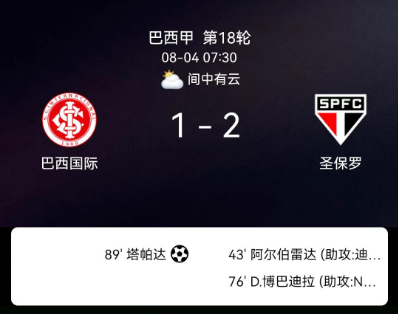 北京时间8月4日,巴西足球甲级联赛第18轮,圣保罗客场2-1击败巴西国际。罗伯特-阿沃莱达上半场首开纪录,达米安-博瓦迪利亚扩大优势,布鲁诺-塔巴塔终场前点射扳回一城,客队全取三分。