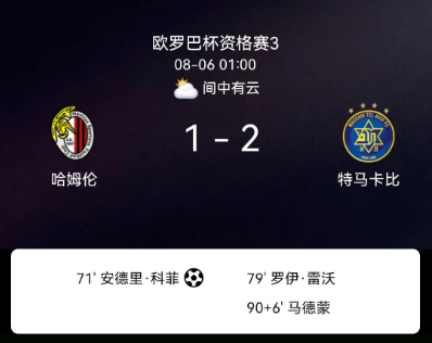 北京时间8月6日,欧足联欧洲联赛资格赛第三轮,特马卡比客场2-1逆转哈斯巴达。菲利普-科菲点球先拔头筹,雷维沃扳平比分,埃拉德-马德蒙补时阶段完成绝杀,助球队晋级下一轮。