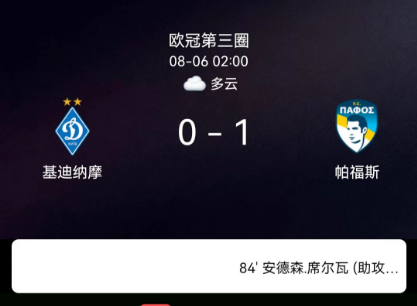 北京时间8月6日,欧冠资格赛第三轮首回合,帕福斯客场1-0爆冷击败基辅迪纳摩。安德森-席尔瓦终场前接若昂-科雷亚助攻打入制胜球,客队凭借防守反击全取三分。