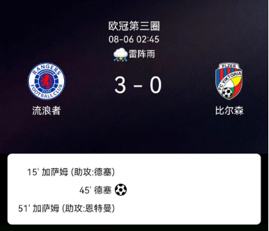 北京时间8月6日,欧冠资格赛第三轮首回合,格拉斯哥流浪者主场3-0大胜比尔森胜利。德瑟斯贡献1球1助攻,加萨马梅开二度,主队凭借高效进攻与强势控球奠定胜局。