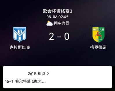 北京时间8月6日,欧洲协会联赛资格赛第三轮首回合,克拉斯维克主场2-0击败格罗德诺。约恩森上半场先拔头筹,克莱茨卡德补时再下一城,主队凭借上半场的强势表现占得晋级主动权。
