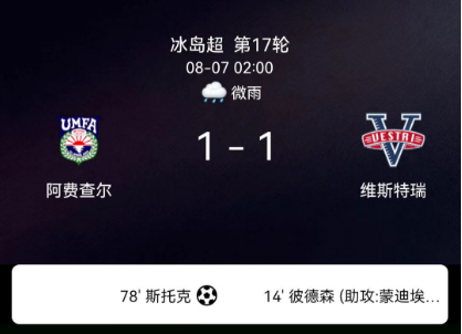 北京时间8月7日,冰岛足球超级联赛第17轮,阿费查尔主场1-1战平维斯特瑞。J-彼泽森上半场为客队先拔头筹,斯托克下半场点球扳平,双方最终握手言和。