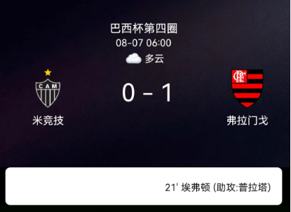 北京时间8月7日,巴西足球杯赛第四轮次回合,米内罗竞技主场4-4战平弗拉门戈。两回合总比分米内罗竞技5-4胜出,惊险晋级下一轮,弗拉门戈虽由埃弗顿破门但未能逆转。