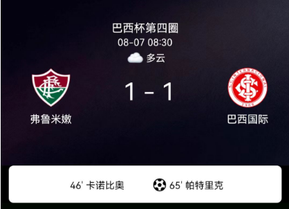 北京时间8月7日,巴西足球杯赛第四轮次回合,弗鲁米嫩塞主场1-1战平巴西国际,以两回合总比分3-2晋级。卡诺比奥半场结束前打破僵局,帕特里克终场前点射救主,主队凭借首回合优势惊险过关。