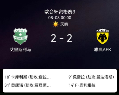 北京时间8月8日,欧洲协会联赛资格赛第三轮首回合,阿里斯主场2-2战平雅典AEK。罗伯托-佩雷拉与雷尔瓦斯为客队两度领先,卡库利斯与戈尔德松为主队两度扳平,双方上演进球大战握手言和。