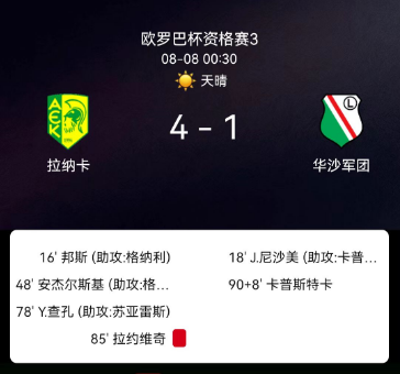 北京时间8月8日,欧足联欧洲联赛资格赛第三轮首回合,AEK拉纳卡主场4-1大胜华沙军团。佩雷-庞斯、安杰尔斯基、查孔、安赫尔-加西亚先后破门,恩萨梅为客队挽回颜面,主队以一场大胜占得晋级先机。