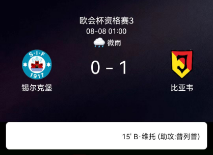 欧洲协会联赛资格赛第三轮首回合,比亚韦客场1-0小胜锡尔克堡。贝尔纳多-维塔尔凭借安德烈亚森的助攻打入全场唯一进球,客队以一场零封占得晋级先机。