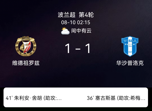 北京时间8月10日,波兰足球超级联赛第4轮,维德祖罗兹主场1-1战平华沙普洛克。塞库尔斯基接豪尔赫-希门尼斯助攻先拔头筹,谢胡半场结束前扳平比分,双方各取一分。