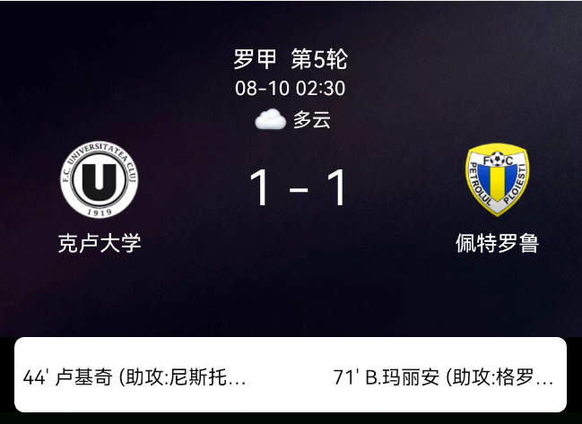北京时间8月10日,罗马尼亚足球甲级联赛第5轮,克卢日大学主场1-1战平佩特罗鲁。卢基奇上半场尾声破门,BogdanMarian下半场中段扳平,双方各取一分。