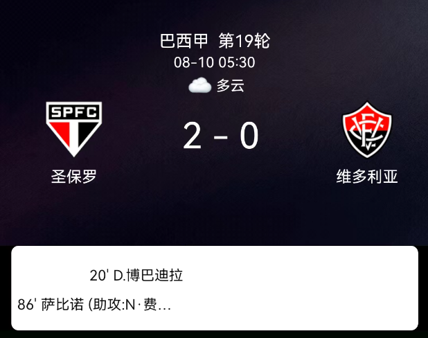 北京时间8月10日,巴西足球甲级联赛第19轮,圣保罗主场2-0击败维多利亚。达米安-博瓦迪利亚早段破局,萨比诺终场前扩大比分,主队零封全取三分。