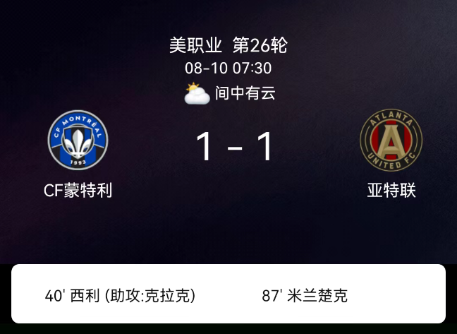 北京时间8月10日,美国职业大联盟常规赛,蒙特利尔主场1-1战平亚特兰大联。西利上半场尾声破门,阿列克谢-米兰丘克终场前扳平,双方各取一分。