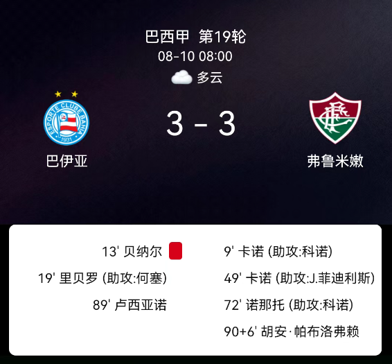 北京时间8月10日,巴西足球甲级联赛第19轮,巴伊亚主场3-3战平弗鲁米嫩塞。卡诺梅开二度+诺纳托破门,埃弗顿-里贝罗、卢西亚诺-茹巴建功,法昆多-贝尔纳尔自摆乌龙,胡安-弗雷特斯补时染红,双方上演进球大战。