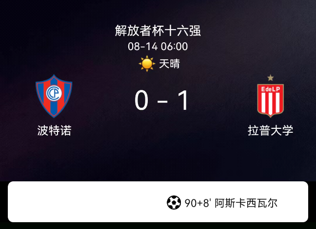 北京时间8月14日,南美解放者杯1/8决赛首回合,拉普拉塔大学生客场1-0小胜波特诺山丘。阿斯卡西瓦尔终场前罚入全场唯一进球,客队凭借此球取得晋级先机。