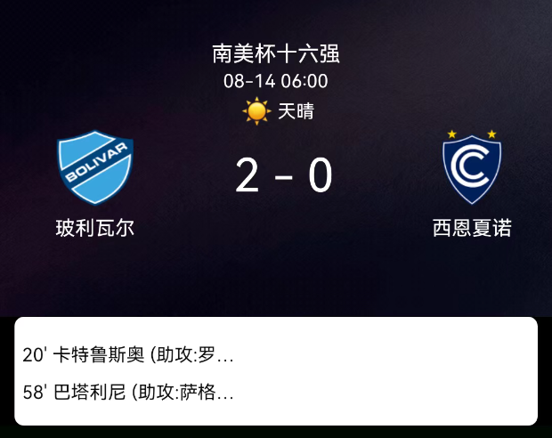 北京时间8月14日,南美洲球会杯1/8决赛首回合,玻利瓦尔主场2-0完胜西恩夏诺。考泰鲁乔早段打破僵局,巴塔尔利尼下半场扩大优势,主队全程压制顺利取得先机。