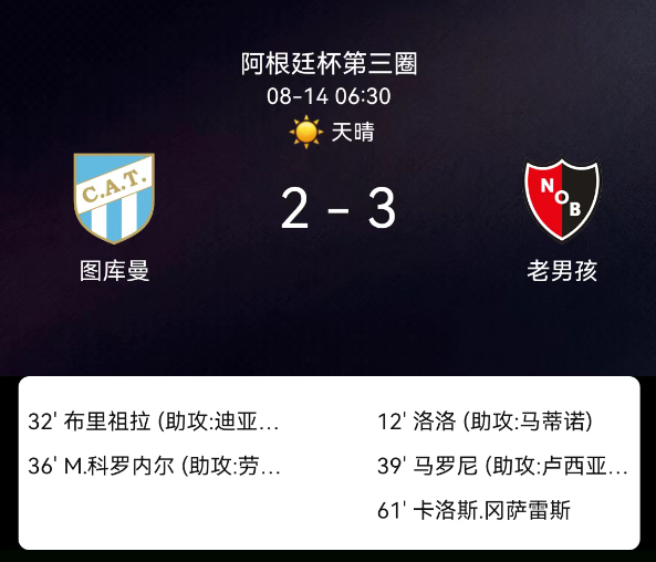 北京时间8月14日,阿根廷杯第三轮,纽维尔老男孩客场3-2逆转图库曼竞技。洛略首开纪录,布里苏埃拉、科罗内尔为对手反超,马罗尼扳平+卡洛斯-冈萨雷斯制胜,主队完成三球大逆转。