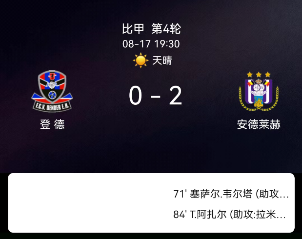 北京时间8月17日,比利时足球甲级联赛第4轮,安德莱赫特客场2-0击败登德。塞萨尔-韦尔塔、索尔根-阿扎尔分别接尼尔松-安古洛助攻破门,客队全取三分。