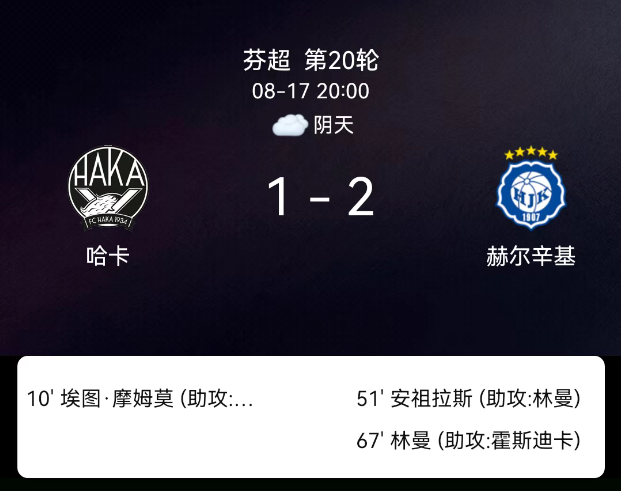 北京时间8月17日,芬兰足球超级联赛第20轮,赫尔辛基客场2-1逆转哈卡。莫莫早段为哈卡破门,安措拉斯半场后扳平,林曼终场前反超比分。