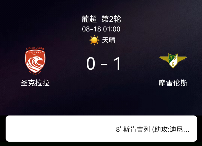 8月18日,葡萄牙足球超级联赛第2轮,莫雷拉人客场1-0击败圣克拉拉。吉列尔梅-谢蒂内开场8分钟接迪尼斯-平托助攻打入制胜球,客队全取三分。