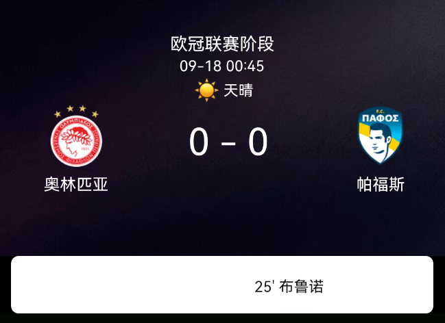 北京时间9月18日00:45欧洲冠军联赛联赛阶段第1轮,奥林匹亚科斯主场迎战帕福斯。帕福斯上半场因布鲁诺-索萨染红被迫十人应战,奥林匹亚科斯久攻未果未能改写比分,最终比分,奥林匹亚科斯0-0帕福斯。