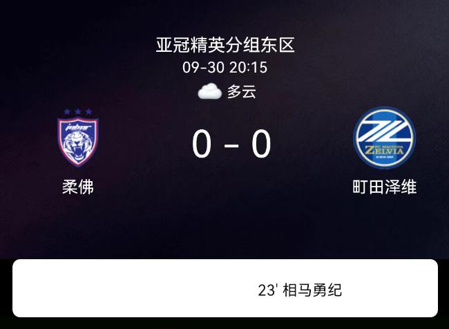 北京时间9月30日亚足联冠军精英联赛第2轮,柔佛新山对阵町田泽维亚。双方均未破门,町田泽维亚错失点球良机,最终比分,柔佛新山0-0町田泽维亚。